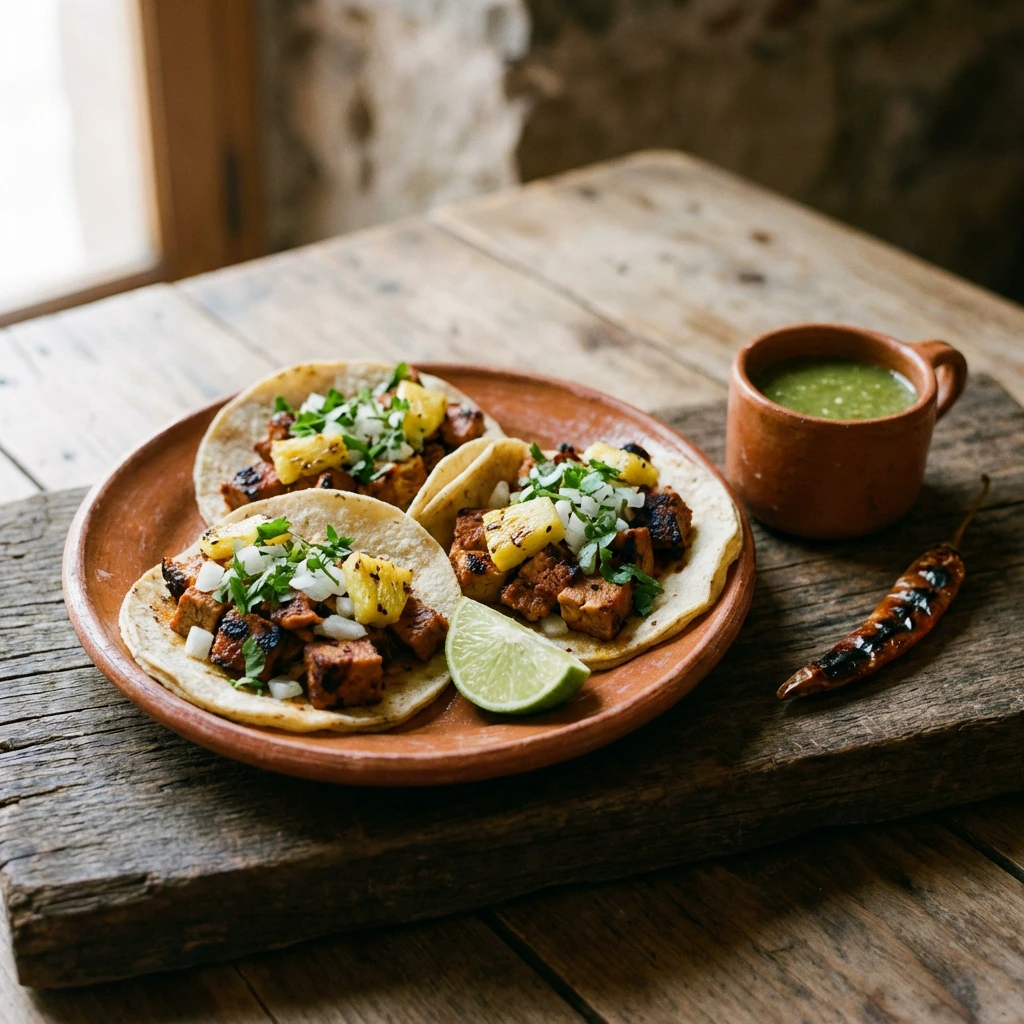 Pork shoulder marinated in guajillo and achiote, pineapple, cilantro, onion.